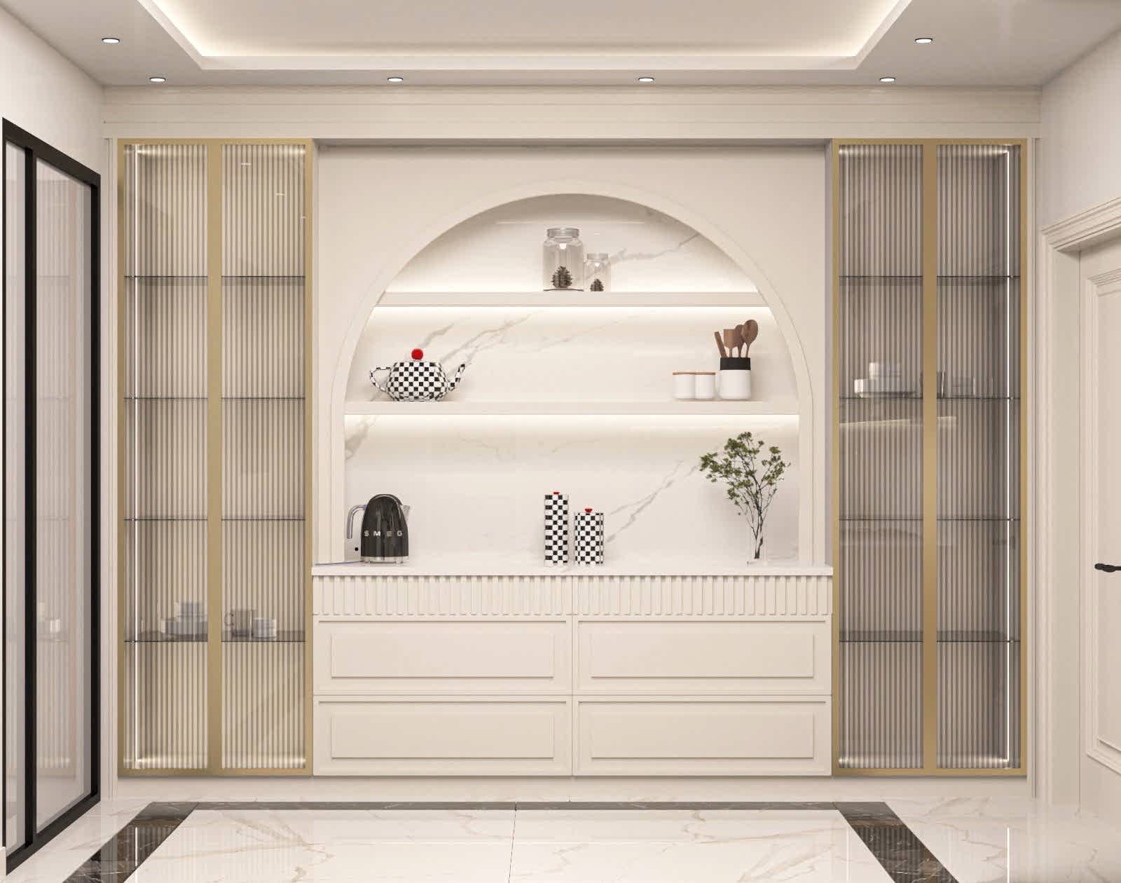 Projenin en karakteristik noktalarından biri olan kahve köşesi, mutfağın en geniş duvarı boyunca kurgulanarak özel bir odak alanı haline getirildi. Her iki yanda konumlandırılan boy dolaplar, hem estetik bir çerçeve oluşturmakta hem de sunum ve depolama açısından işlevsel çözümler sunmaktadır. Orta bölümde ise çay ve kahve makineleri için ayrılan alan, günlük kullanımda maksimum verim sağlayacak şekilde planlanmış; aynı zamanda şık bir sunum alanı olarak değerlendirilmiştir.