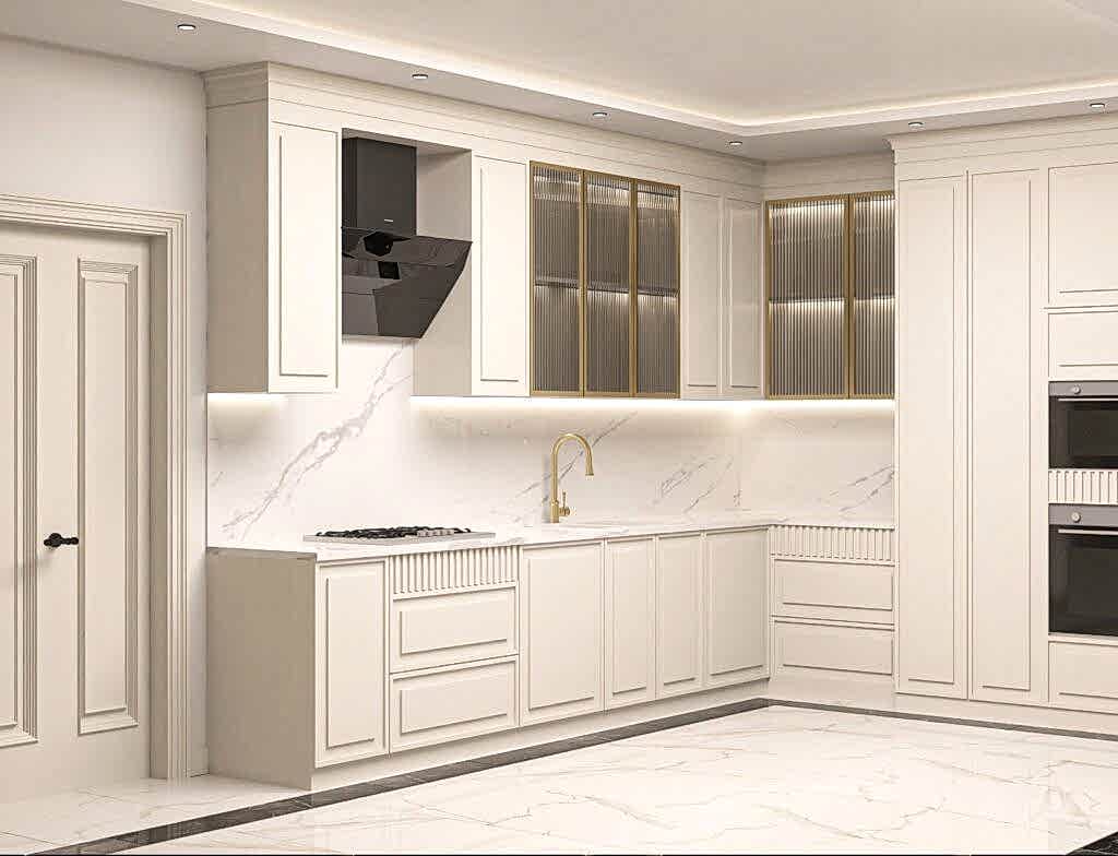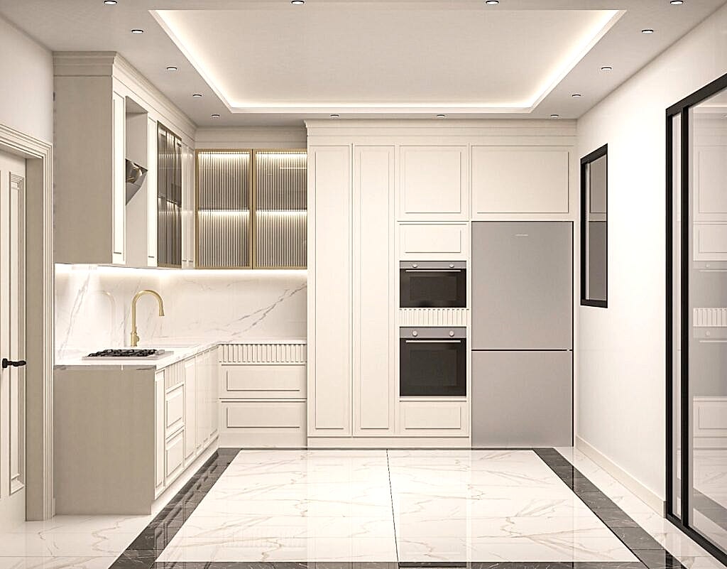 Projede tercih ettiğimiz lake boyalı mutfak dolapları, mekâna hem pürüzsüz hem de premium bir görünüm kazandırırken; mermer görünümlü cam yüzeyler, CNC işlemeli kapak detayları ve boy dolap uygulamaları ile güçlü bir tasarım dili oluşturduk. Tüm bu malzeme ve detaylar bir araya gelerek mutfakta dengeli, şık ve zamansız bir atmosfer ortaya çıkardı.
