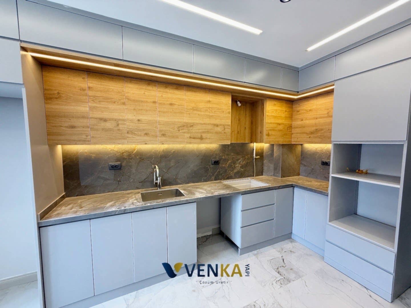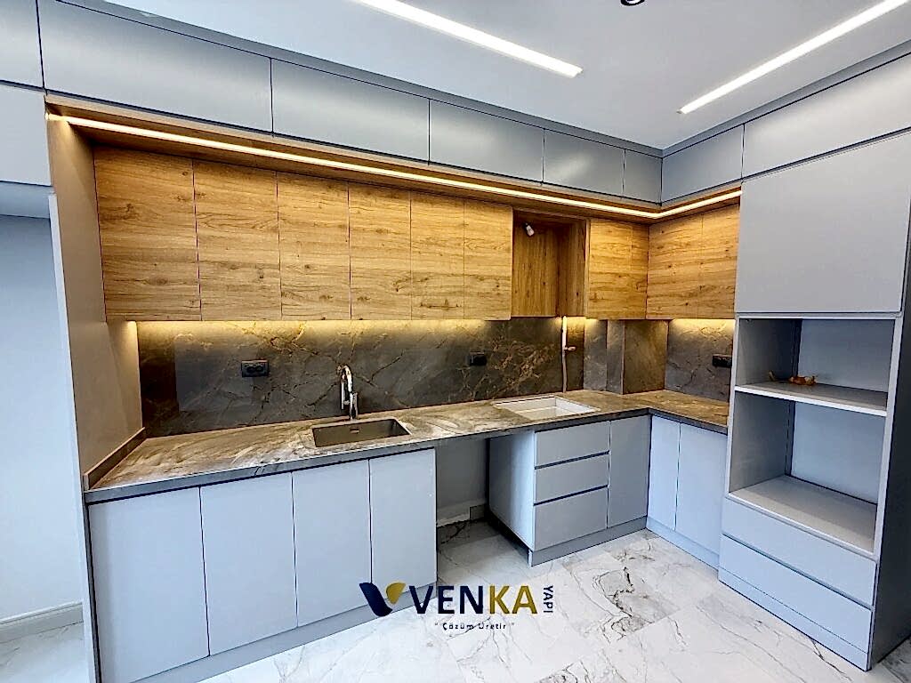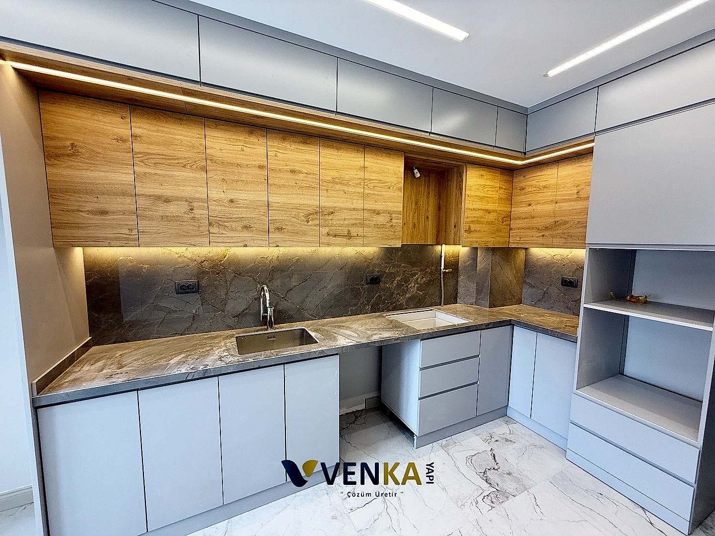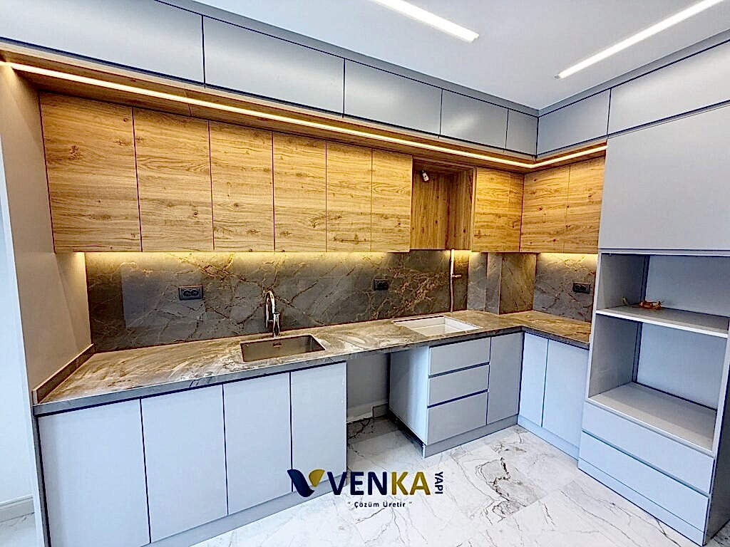 Projenin kalbinde yer alan mutfak bölümünde, modern mutfak tasarımı anlayışıyla hareket edildi. Ahşabın sıcak dokusu ile gri tonların sofistike uyumu bir araya getirilerek hem samimi hem de çağdaş bir atmosfer oluşturuldu. Detaylarda tercih edilen özel üretim uygulamalar ve yüzey seçimleri, mekânın karakterini güçlendirirken uzun ömürlü kullanım avantajı da sağladı.