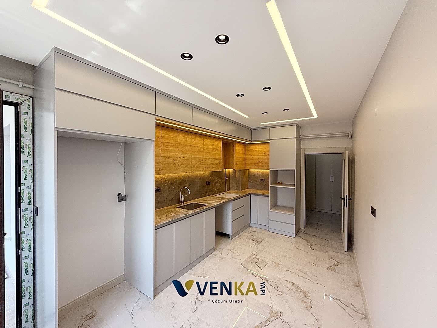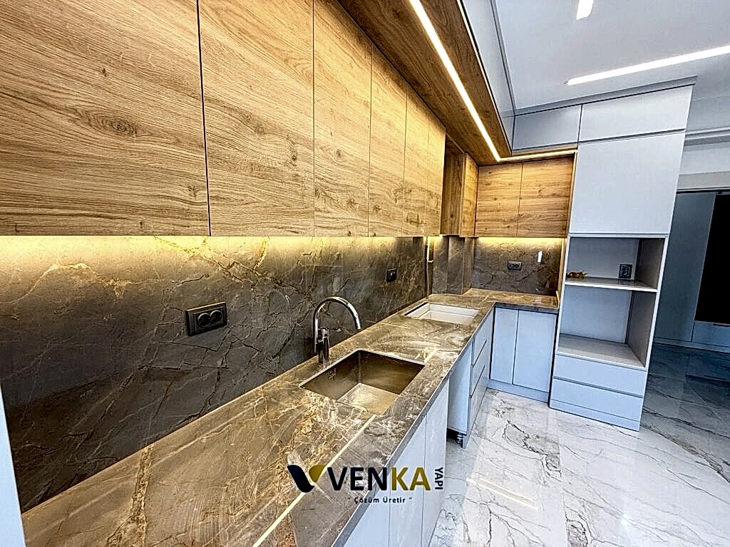 Aydınlatma kurgusu ise projenin en dikkat çekici unsurlarından biri olarak öne çıkıyor. Kullanılan özel aydınlatma çözümleri, ışığın mekân içerisinde dengeli ve homojen bir şekilde yayılmasını sağlarken, aynı zamanda mutfağa derinlik ve premium bir ambiyans kazandırıyor. Bu sayede yalnızca işlevsel değil, aynı zamanda görsel olarak da güçlü bir yaşam alanı elde edildi.